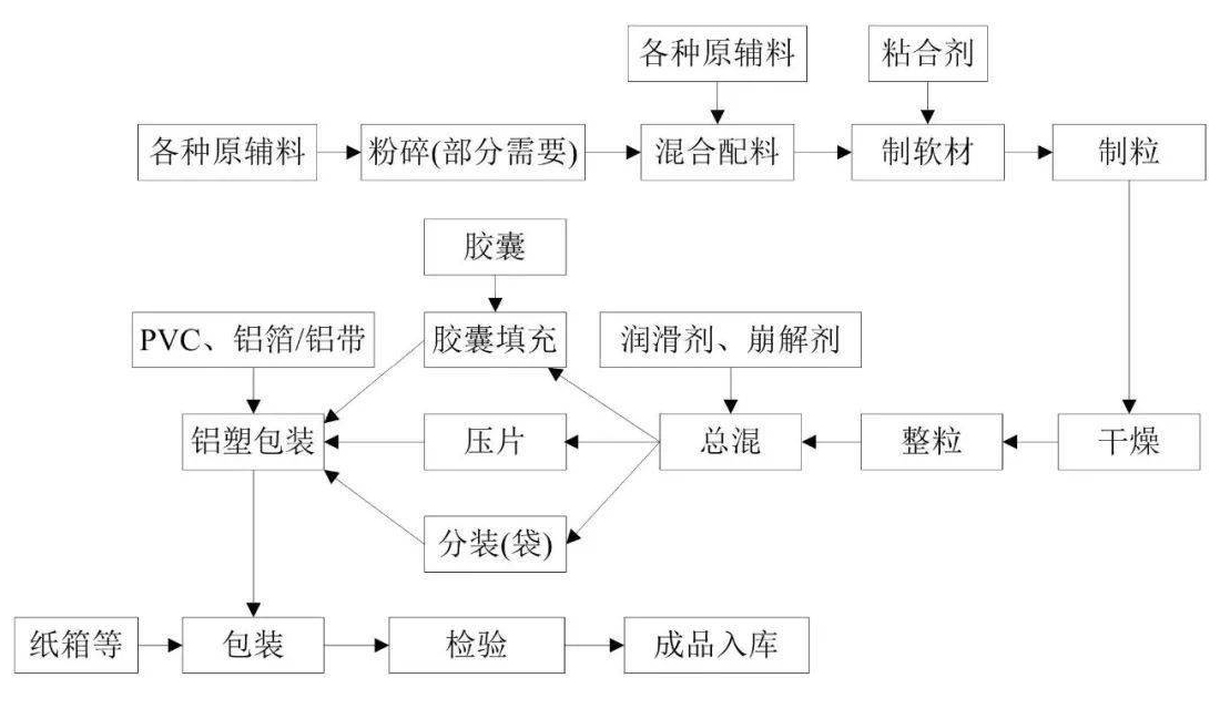 混装制剂类药物是指通过混合、加工和配制等操作方式、工艺用各种原料药制成的药物成品。混装制剂类药物按剂型可分为固体制剂类、注射剂类和其他制剂类等。具体包括片剂、胶囊剂、颗粒剂、注射液、输液、粉针剂、冻干粉针剂、缓释/控释片等。固体制剂类和注射剂类生产过程中废气污染源主要为粉尘。