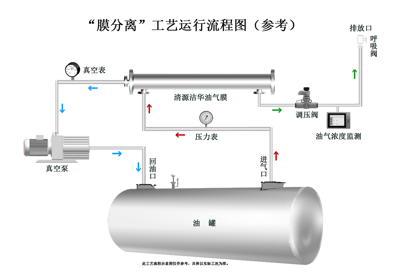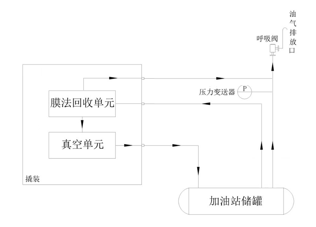 物料(汽柴油/有机气体)气体和空气混合物,在一定压力下 (低于呼吸阀设定压力),当此压力高于装置启动压力区间的上限时,真空单元启动,在真空泵作用下,低浓度的物料气体经过“膜法回收单元”处理后,物料气体浓缩到一定的浓度,回到物料储罐,当储罐的压力低于装置启动压力区间的下限时,装置停止运行。